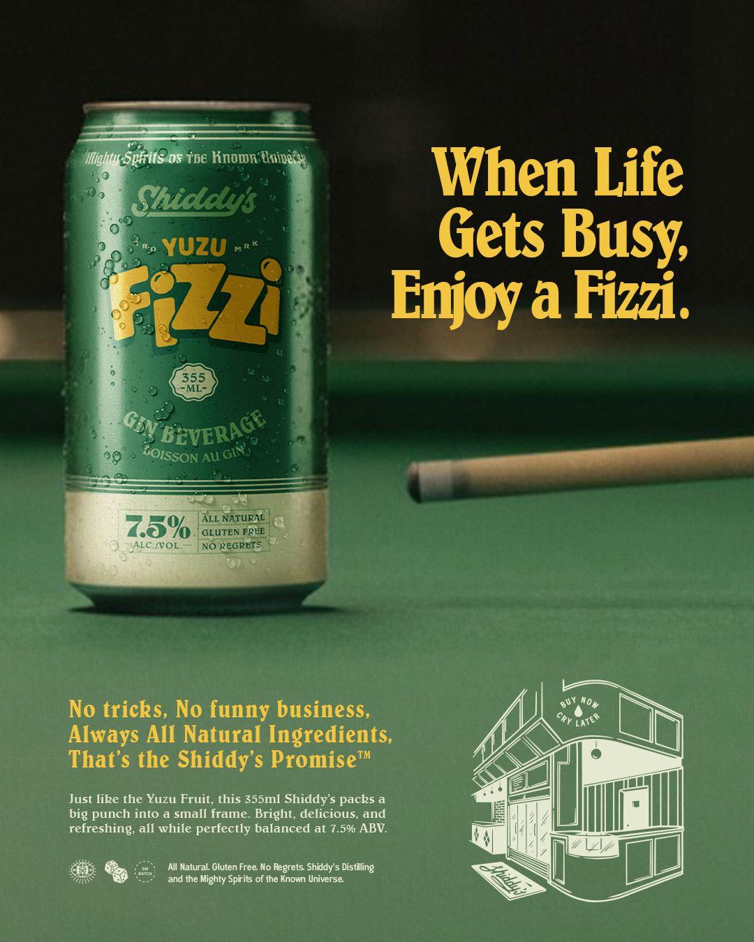 The packaging for Fizzi and Brambo captures the playful, "super natural" energy of Shiddy’s Distilling through two distinct visual identities. The Fizzi logo uses high-tension, bouncy geometry to signal its sharp 7.5% punch, while the Brambo wordmark features inflated, liquid-soft letterforms that mirror a more approachable 5% profile. Jam-packed with a mix of technical specs and approachable fun, the design creates an immersive world-building experience on every can.